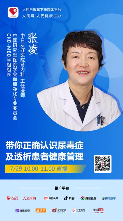 7月29日10:00—11:00,人民日報(bào)社旗下新媒體“人民好醫(yī)生”客戶端將邀請中日友好醫(yī)院腎內(nèi)科主任醫(yī)師、中國研究型醫(yī)院學(xué)會血液凈化專業(yè)委員會CKD-MBD學(xué)組組長張凌做客直播間,和大家分享正確的尿毒癥及透析患者健康管理,歡迎大家收看!