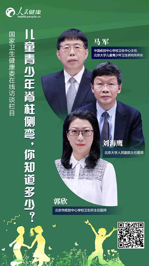 人民網北京10月20日電(記者崔元苑)脊柱側彎作為脊柱彎曲異常的一種常見類型,是危害兒童青少年健康的常見疾病之一。近年來,兒童青少年脊柱側彎發生率呈明顯上升趨勢。日前,人民網聯合國家衛生健康委,邀請中國疾控中心學校衛生中心主任、北京大學兒童青少年衛生研究所教授馬軍,北京大學人民醫院主任醫師劉海鷹,北京市疾控中心主任醫師郭欣,對于網友關心的兒童青少年脊柱側彎形成的原因、如何預防、治療等相關問題進行解答,呼吁家庭、學校以及全社會正確認識脊柱側彎疾病,早發現、早治療,守護好兒童青少年脊柱健康。