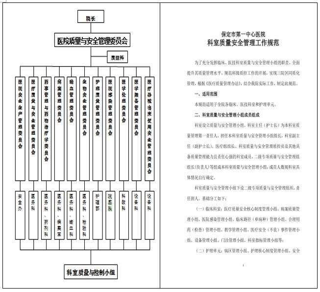 從院級層面,該醫院制定了《科室質量安全管理工作規范》,科室成立了醫療質量管理工作小組,組長由科室主要負責人擔任,指定專人負責日常具體工作。并制定了《科室質量與安全管理小組管理辦法》,明確了科室質量與安全管理小組工作職責,制定了科室質量與安全管理小組活動內容及要求。