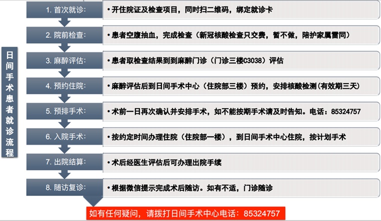 日間手術(shù)在歐美等發(fā)達(dá)國(guó)家已占擇期手術(shù)的80%以上,我國(guó)日間手術(shù)開(kāi)展較好的醫(yī)院日間手術(shù)占比為40.5%,但大多數(shù)醫(yī)院日間手術(shù)開(kāi)展率較低,主要由于沒(méi)有較好的管理平臺(tái)及管理模式參考。2019年之前,我院日間手術(shù)開(kāi)展率也較低,存在同樣的問(wèn)題。因此,我院建立了“基于麻醉手術(shù)部平臺(tái)的日間手術(shù)中心一體化管理模式”,該模式由醫(yī)務(wù)部主管、麻醉手術(shù)部主導(dǎo),服務(wù)手術(shù)科室的綜合運(yùn)轉(zhuǎn)模式。其管理團(tuán)隊(duì)由科主任、護(hù)士長(zhǎng)管理,設(shè)置6名醫(yī)生、7名護(hù)士、1名護(hù)理員完成日間手術(shù)中心患者圍術(shù)期醫(yī)護(hù)工作。同時(shí),日間手術(shù)中心引進(jìn)了信息化管理流程系統(tǒng),即患者首次就診掃描二維碼,綁定就診卡,自動(dòng)被納入信息化系統(tǒng)內(nèi),引導(dǎo)患者完成麻醉評(píng)估、手術(shù)預(yù)約、院前宣教、術(shù)前準(zhǔn)備、手術(shù)知情、手術(shù)麻醉、術(shù)后恢復(fù)以及術(shù)后隨訪等全部圍術(shù)期醫(yī)療、護(hù)理工作,極大保障了患者的安全,真正實(shí)現(xiàn)了“一站式”醫(yī)療服務(wù)(圖1)。