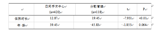 表1 日間手術(shù)中心及分散管理日間患者相關(guān)信息對(duì)比