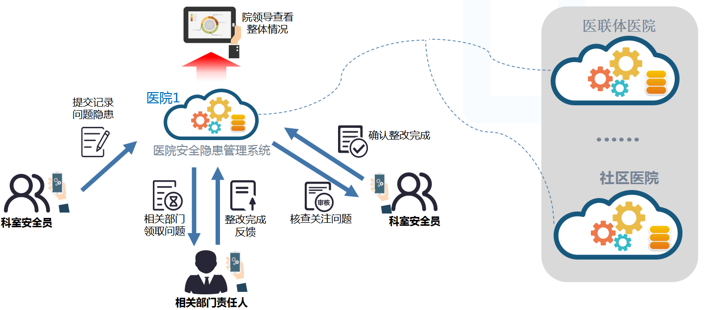 基于以上原因,醫院引入“安全隱患巡查系統”用于改善和加強醫院安全管理行為。通過移動互聯網技術為醫院搭建安全管理云平臺,統一各層級安全管理人員的行為,從而實現安全隱患排查、信息共享和數據統計分析等安全管理行為。