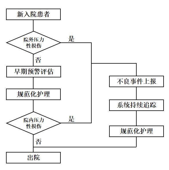 為有效降低我院壓力性損傷發生率,攻克神經科壓力性損傷防治難題,改善臨床護理實踐,我院護理部于2015年在院領導和相關科室支持下實現護理風險評估表單電子化評估,2017年對護理風險評估表單進行更新,針對壓力性損傷表單內危險因素制定臨床可行的預防性護理措施,責任護士可根據患者情況結構化勾選、導入護理記錄單,并在臨床工作中執行針對性、同質化護理措施。2018年我院實現了患者安全提示的信息化管理,責任護士可根據患者情況實時修改床頭安全提示牌內容;同年,在保證對院內獲得性壓力性損傷不良事件討論、根因分析、制定整改措施、整改措施落實情況現場督導的基礎上,我院在護理信息系統上線了傷口護理記錄單,旨在對所有壓力性損傷轉歸的全程觀察、記錄;同年,轉交接核查單上線,所有手術轉交接、病房轉交接必須描述患者皮膚情況。2019年我院取消床尾紙質翻身卡,使用PDA移動端的電子翻身卡,節約紙張資源的同時使護理行為有跡可循。壓力性損傷預防和護理臨床安全系統最大限度實現壓力性損傷評估早期預警、規范臨床護理實踐、不良事件根因分析和追蹤反饋。具體如圖2所示。