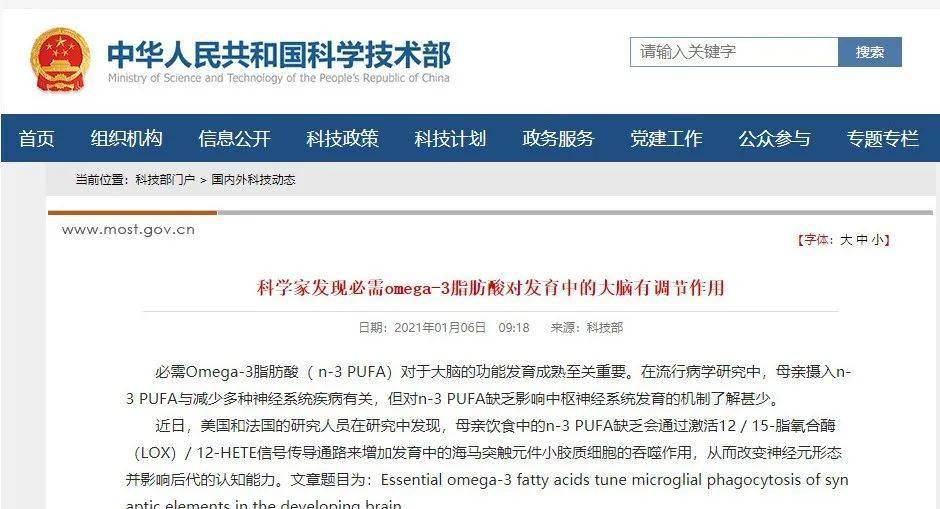 2021年1月6日,科技部官網最新發布的題為《科學家發現必需omega-3脂肪酸對發育中的大腦有調節作用》指出,必需Omega-3脂肪酸( n-3 PUFA)對于大腦的功能發育成熟至關重要。在流行病學研究中,母親攝入n-3 PUFA與減少多種神經系統疾病有關,但對n-3 PUFA缺乏影響中樞神經系統發育的機制了解甚少。