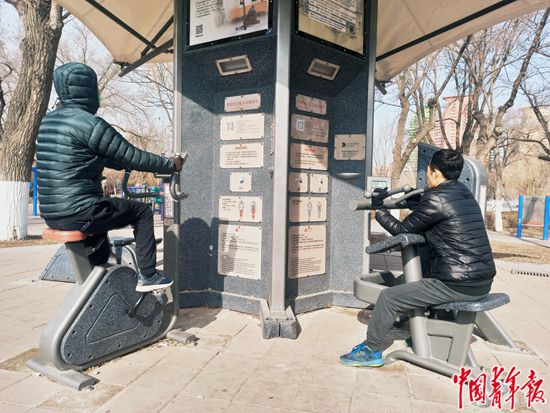 公園里來了智能健身教練。3月10日,在遼寧省沈陽市萬柳塘公園,市民在使用智能健身器材鍛煉身體。智能自發電立式健身車的頂棚既可以遮陽擋雨,還可以收集太陽能轉化為電能,電子屏幕上能顯示運動數據。