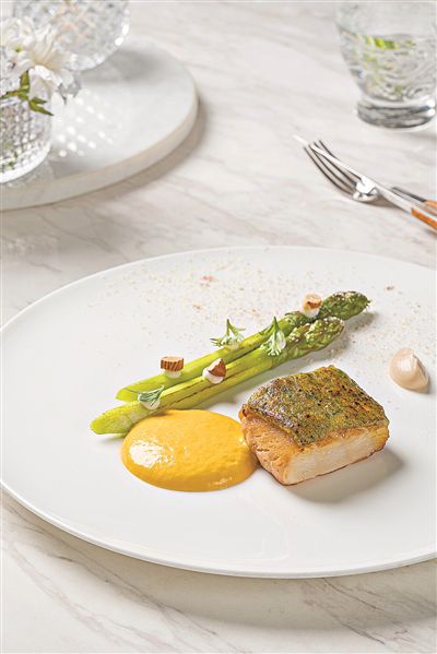蘆筍亦是春天的菜肴,它給意大利的餐桌帶來了盎然綠意。Michele將檸檬汁和紅酒調味過后的黑鱈魚煎出金色的光澤,搭配當季的蘆筍,并以富有南意大利風味的銀魚柳沙巴雍醬汁點綴。黑鱈魚甜潤柔軟,帶有微酸的檸檬香氣。輕盈的泡沫狀醬汁為食材帶來咸鮮口感之余,更賦予了多層次的味覺感受。(文、圖/廣州日報全媒體記者 曾繁瑩 通訊員李嘉裕、許可萱)