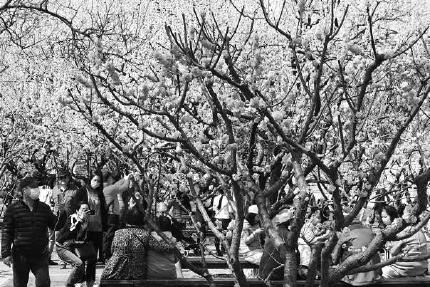 明城墻遺址公園梅花盛開,市民戴口罩賞花。 本報記者 劉平攝