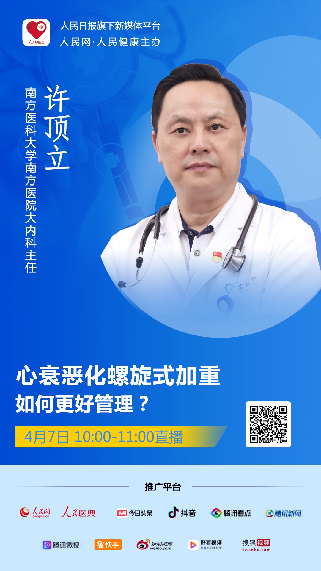 2021年4月7日(周三)10:00-11:00,南方醫(yī)科大學(xué)南方醫(yī)院大內(nèi)科主任許頂立做客人民日?qǐng)?bào)社旗下新媒體“人民好醫(yī)生”客戶(hù)端,為大眾答疑解惑。