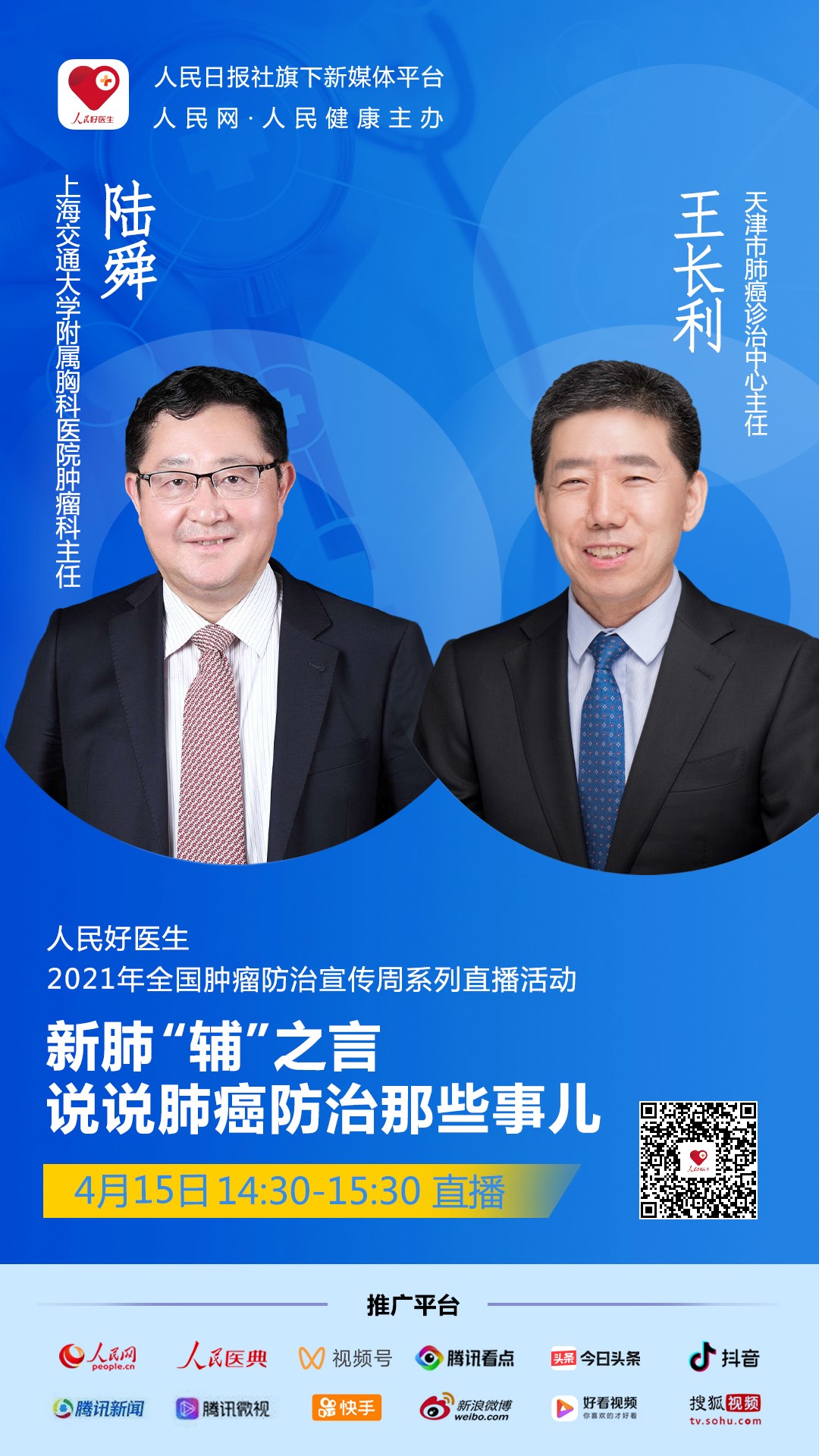 4月15日,恰逢第27個全國腫瘤防治宣傳周到來之際,人民日報社旗下新媒體“人民好醫生”客戶端將邀請上海交通大學附屬胸科醫院腫瘤科主任陸舜,天津醫科大學腫瘤醫院、天津市肺癌診治中心主任王長利做客直播間,從內科及外科醫生的角度和我們一起來說說肺癌防治那些事兒,千萬不要錯過。