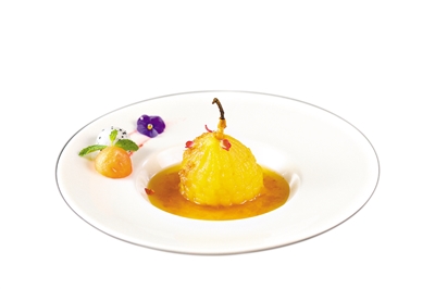 朱雪敏稱,荼薇可以做成凍干露、氣泡水、做成醬、酒等等。相比起普通的玫瑰花,它的香氣是濃郁張揚而奔放,能一把將人的嗅覺抓住,令人難忘。粵菜師傅馬如鑒用這荼薇烹制了一道山楂荼薇雪梨和一道荼薇酒火焰羅氏蝦。前者,是用荼薇花醬和荼薇花酒調(diào)和成冷湯底,將雪梨浸泡其中,待幾日之后,風(fēng)味滲透入雪梨內(nèi),方可作為一道山楂荼薇雪梨甜品;后者,通過明火炙烤將特有的清新飄逸的荼薇花芬芳與醬汁濃郁的羅氏蝦融合在一起,達到鮮香美味的口感,色香味俱全。