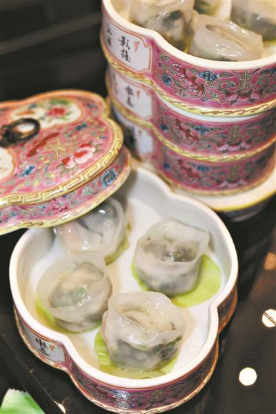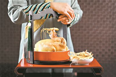 馬師傅用小小人參烹制多道佳肴:水晶雞、燉湯、人參菠菜餃……人參水晶雞是甄選肉質(zhì)鮮美的清遠雞及長白山5年干人參,采用廣式傳統(tǒng)清蒸手法,使得人參的獨特香氣完全地滲入腌制過的肉質(zhì)中,皮爽肉滑鮮味濃,保留了雞肉原汁原味、外皮彈的特點。人參菠菜餃以瘦豬肉為主料,豬肉有滋陰潤燥、益氣生津的功效,搭配富含鐵元素的菠菜和長白山3年鮮人參打成的人參粉,別有一番滋味。人參燉水魚湯,則用大連鮑魚、水魚、新鮮人參和老雞足足燉上4個小時,味道融合恰到好處,一分不多半分不少,讓人甚為舒坦,不燥不過。朱雪敏認(rèn)為此湯尤其適合這個季節(jié)飲用。