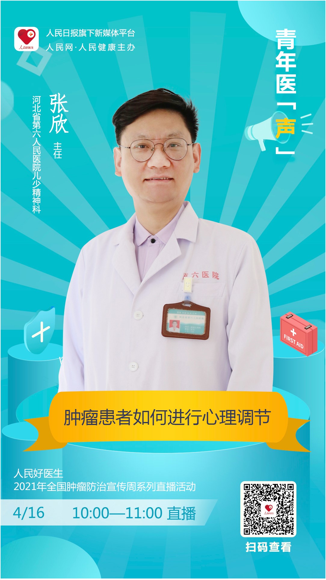 4月16日10:00-11:00人民日報社旗下新媒體“人民好醫(yī)生”客戶端將邀請河北省精神衛(wèi)生中心心理救援隊副隊長、河北省第六人民醫(yī)院兒少精神科主任 張欣做客“青年醫(yī)‘聲’”欄目,為大家講解腫瘤患者該如何進行心理調節(jié),患者家屬該如何配合醫(yī)生進行心理治療,千萬不要錯過。