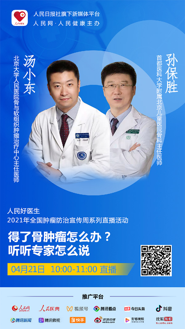 2021年4月21日10:00-11:00我們有幸邀請到北京大學人民醫院骨與軟組織腫瘤治療中心主任醫師湯小東,首都醫科大學附屬北京兒童醫院骨科主任醫師孫保勝做客人民好醫生名醫直播欄目。給公眾科普骨腫瘤相關知識。