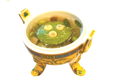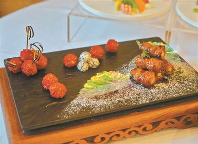 荷塘春月色則以魚肉、蓮子、蛋白、火腿等做出荷塘月色的意境,此菜既突出粵菜“清鮮嫩滑”的特點,更形象顯露出粵菜“優雅脫俗”的風格;“荔熟秋蟬鳴”取嶺南佳果元素,何物令得“一騎紅塵妃子笑”?原是荔枝也!粵菜師傅巧妙運用雞胸肉蓉做荔枝來比喻“果”,五花肉切片包卷荔浦芋來比作“蔬”,突出廣東地區果蔬物產豐富的創作思維;廣東屬沿海地區,蝦本是居民餐桌常見之物,而姜則是粵菜烹飪之引物,“無菜不落姜”已為粵菜師傅的烹調手法,“金絲伴彩霞”運用多種烹飪法,采用一蝦兩食配以炸姜絲突出粵菜風味。