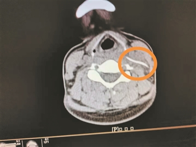 4月1日,陳女士帶女兒到南方醫科大學第三附屬醫院就診,想起自己頸部不舒服,就順便到耳鼻咽喉科就診,副主任醫師曹慶碩接診后,請患者平躺檢查,此時陳女士感覺頸部更痛了,醫生懷疑頸部有異物,于是進行了頸部CT平掃,果然發現左側頸動脈鞘區有異物。