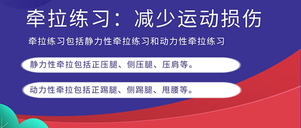 牽拉練習包括靜力性牽拉練習和動力性牽拉練習。各種牽拉練習可以增加關節的活動幅度,提高運動技能,減少運動損傷。