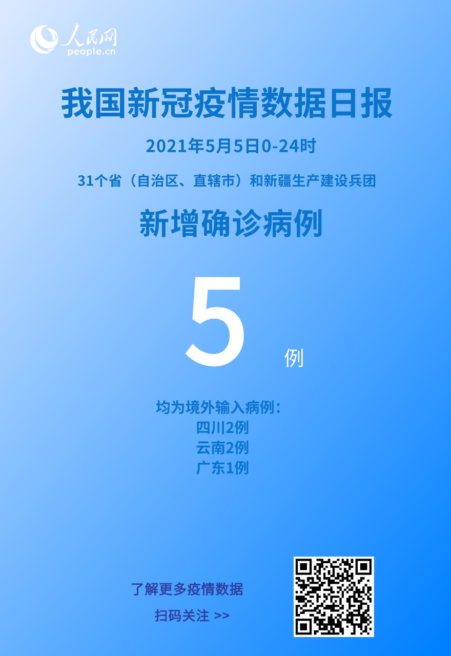 人民網(wǎng)北京5月6日電 (記者崔元苑)今日,國家衛(wèi)生健康委于官網(wǎng)發(fā)布了截至5月5日24時新型冠狀病毒肺炎疫情最新情況。5月5日0—24時,31個省(自治區(qū)、直轄市)和新疆生產(chǎn)建設兵團報告新增確診病例5例,均為境外輸入病例(四川2例,云南2例,廣東1例);無新增死亡病例;新增疑似病例1例,為境外輸入病例(在上海)。