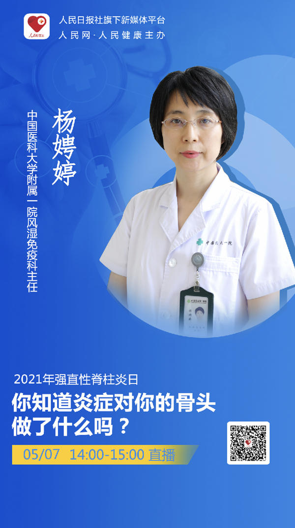 5月8日是今年的世界強直性脊柱炎日,人民日報社旗下新媒體“人民好醫生”客戶端將于2021年5月7日(周五)14:00-15:00,邀請中國醫科大學附屬一院風濕免疫科主任楊聘婷做客直播間,就強直性脊柱炎對骨關節造成的影響等相關內容進行科普直播,歡迎收看!