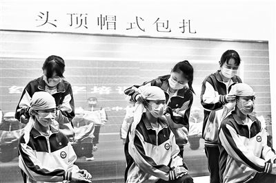 豐臺(tái)二中小屯校區(qū)的學(xué)生代表進(jìn)行創(chuàng)傷包扎急救展示