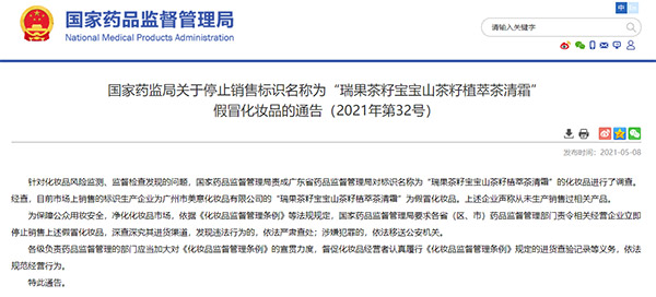 國(guó)家藥監(jiān)局:“瑞果茶籽寶寶山茶籽植萃茶清霜”為假冒化妝品 立即停止銷售