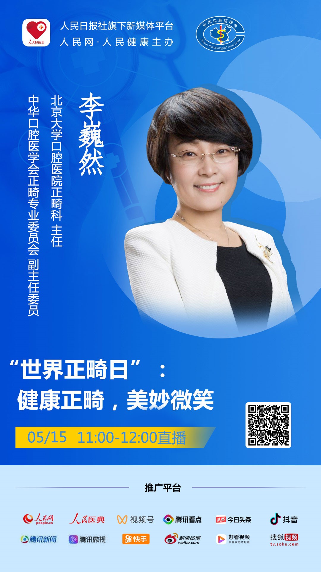 今年5月15日是第五個“世界正畸日”(World OrthodonticHealth Day)。世界正畸日的設(shè)立,旨在喚起廣大民眾對正畸的認識,促進廣大正畸醫(yī)師為廣大民眾提供健康的正畸治療。牙齒不完美,想做正畸,但是做正畸會有這種那種顧慮,關(guān)于各種傳言,可信不可信呢?5月15日11:00至12:00我們邀請到北京大學口腔醫(yī)院正畸科主任李巍然做客人民好醫(yī)生名醫(yī)直播欄目。給公眾科普口腔正畸的相關(guān)知識。
