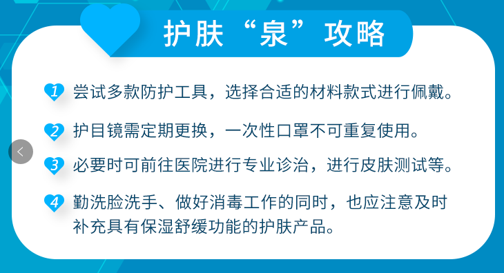 “面部過敏、皮膚損傷和繼發性損傷是長時間佩戴口罩最常見的三大問題。”王剛在訪談中表示,其中過敏現象因人而異,與外界環境刺激、皮膚表皮生態和化學成分物質等均有關,應針對膚質選擇不同材質及款式的口罩或護目鏡進行嘗試,選擇適合自己的產品。如不清楚自己的膚質狀況可前往醫院進行過敏源測試。皮膚損傷是更為嚴重的情況,部分醫護人員甚至由于護目鏡的壓迫引發皮膚感染,需注意定期更換防護用具,適時調整佩戴位置和角度,并注意衛生和消毒,避免二次感染;對于常見防疫措施帶來的皮膚繼發性損傷,比如頻繁清洗面部及手部,造成的皮膚干燥甚至皮炎濕疹等,建議及時采用有針對性的護膚產品,做好皮膚保濕和養護。