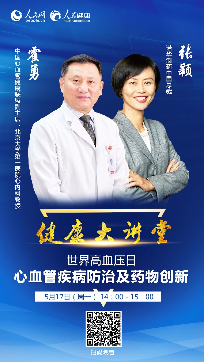 5月17日14:00至15:00我們有幸邀請到中國心血管健康聯盟副主席、北京大學第一醫院心內科教授霍勇;諾華制藥(中國)總裁張穎做客人民健康大講堂,分享心血管疾病防治及藥物創新話題。