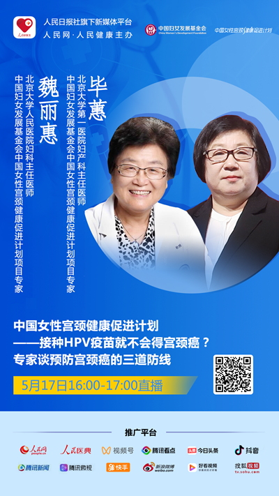 5月17日(星期一)16:00至17:00,中國婦女發展基金會中國女性宮頸健康促進計劃項目專家、北京大學人民醫院婦科主任醫師魏麗惠,中國婦女發展基金會中國女性宮頸健康促進計劃項目專家、北京大學第一醫院婦產科主任醫師畢蕙將做客演播室,為大眾普及宮頸癌預防相關科普知識,千萬不要錯過。