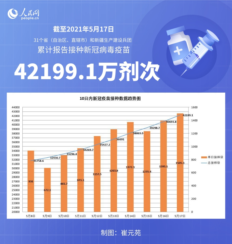 人民網北京5月18日電 (記者崔元苑)據國家衛生健康委官網消息,截至2021年5月17日,31個。ㄗ灾螀^、直轄市)及新疆生產建設兵團累計報告接種新冠病毒疫苗42199.1萬劑次。17日單日接種新冠病毒疫苗1505.3萬劑次。