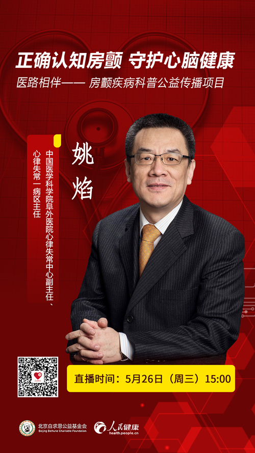 5月26日(周三)15:00-16:00,人民日報社旗下新媒體“人民好醫生”客戶端將邀請中國醫學科學院阜外醫院心律失常中心副主任、心律失常一病區主任姚焰做客直播間,就房顫等相關內容進行科普直播,歡迎收看!