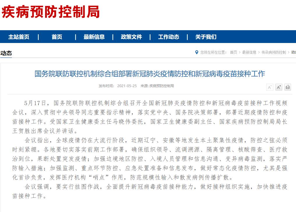 人民網北京5月25日電 (張文婷)近日,國務院聯防聯控機制綜合組召開全國新冠肺炎疫情防控和新冠病毒疫苗接種工作視頻會議,部署近期疫情防控和疫苗接種工作。會議強調,要實行掛圖作戰,全面提升新冠病毒疫苗接種能力,做好接種組織實施,加快推進疫苗接種工作。