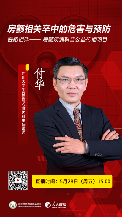 5月28日(周五)15:00至16:00,人民日報社旗下新媒體“人民好醫(yī)生”客戶端將邀請四川大學(xué)華西醫(yī)院心血管內(nèi)科主任醫(yī)師付華做客直播間,就房顫卒中的危害與預(yù)防等相關(guān)內(nèi)容進行科普直播,歡迎收看!
