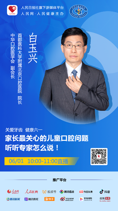 6月1日10:00至11:00,邀請到首都醫科大學附屬北京口腔醫院院長,中華口腔醫學會副會長白玉興做客人民好醫生名醫直播欄目,探討兒童口腔常見的問題,給公眾科普兒童口腔問題的相關知識。