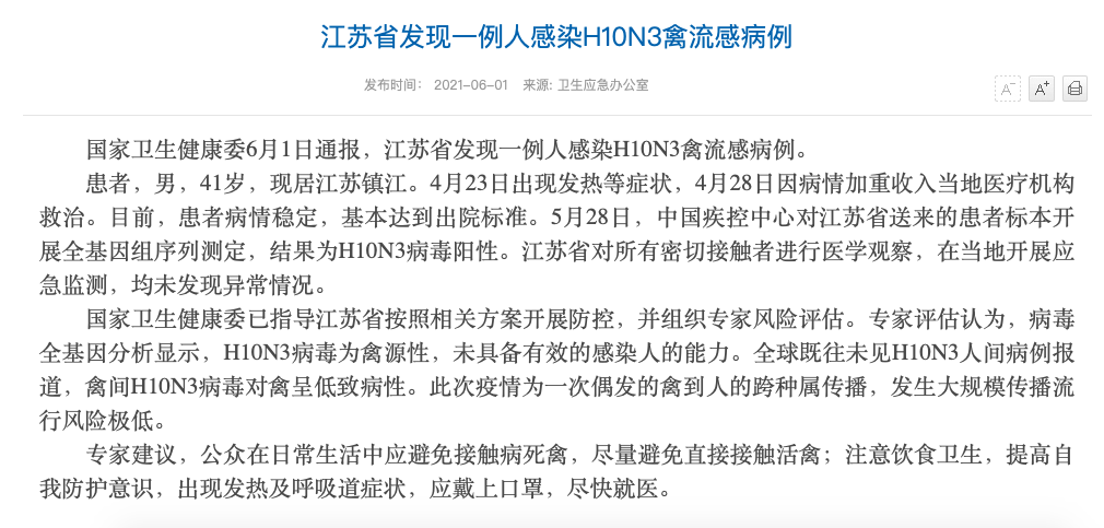 國家衛健委:江蘇省發現一例人感染H10N3禽流感病例