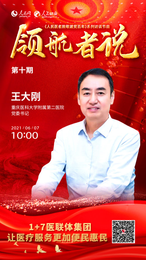 6月7日10:00,重慶醫科大學附屬第二醫院黨委書記王大剛做客演播室,以“1+7醫聯體集團 讓醫療服務更加便民惠民”為主題進行訪談。