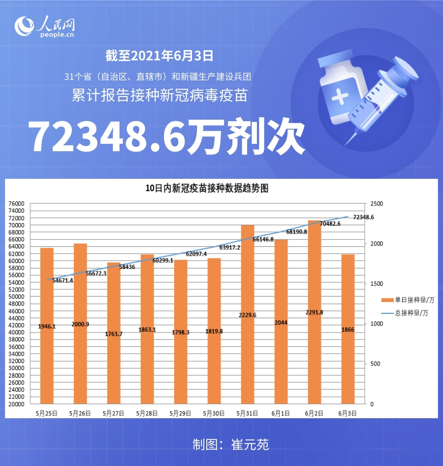 人民網北京6月4日電 (記者崔元苑)據國家衛生健康委官網消息,截至2021年6月3日,31個省(自治區、直轄市)和新疆生產建設兵團累計報告接種新冠病毒疫苗72348.6萬劑次。