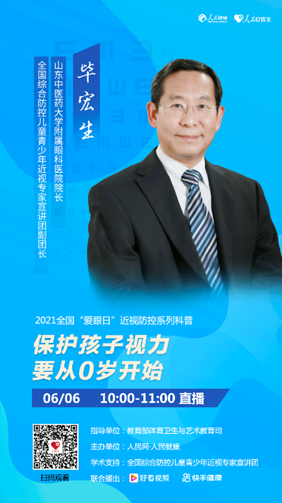 6月6日(周五)10:00至11:00,山東中醫藥大學附屬眼科醫院院長、全國綜合防控兒童青少年近視專家宣講團副團長畢宏生將做客人民日報社旗下新媒體“人民好醫生”客戶端,就“兒童視力保護”相關話題進行在線分享,歡迎屆時收看。
