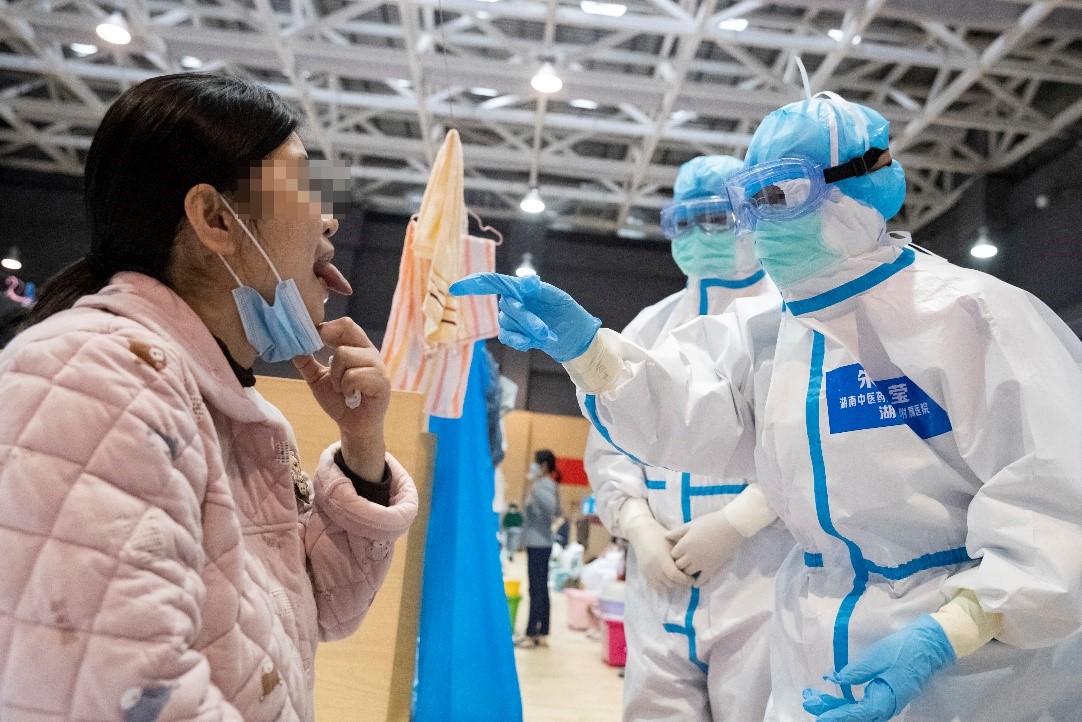 2020年2月25日,在江夏方艙醫院,湖南中醫藥大學第一附屬醫院副院長、江夏方艙醫院副院長朱瑩(右一)查看新冠肺炎患者的舌象。新華社記者 沈伯韓攝