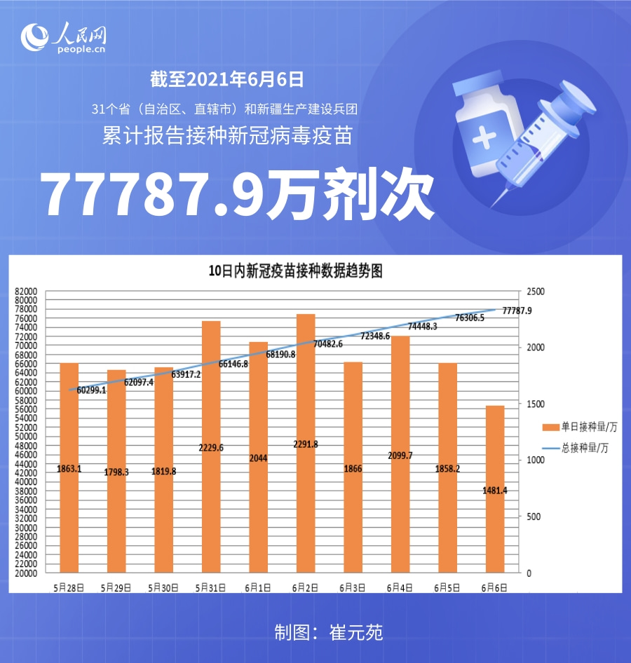人民網(wǎng)北京6月7日電 (記者崔元苑)據(jù)國家衛(wèi)生健康委官網(wǎng)消息,截至2021年6月6日,31個省(自治區(qū)、直轄市)和新疆生產(chǎn)建設(shè)兵團(tuán)累計報告接種新冠病毒疫苗77787.9萬劑次。