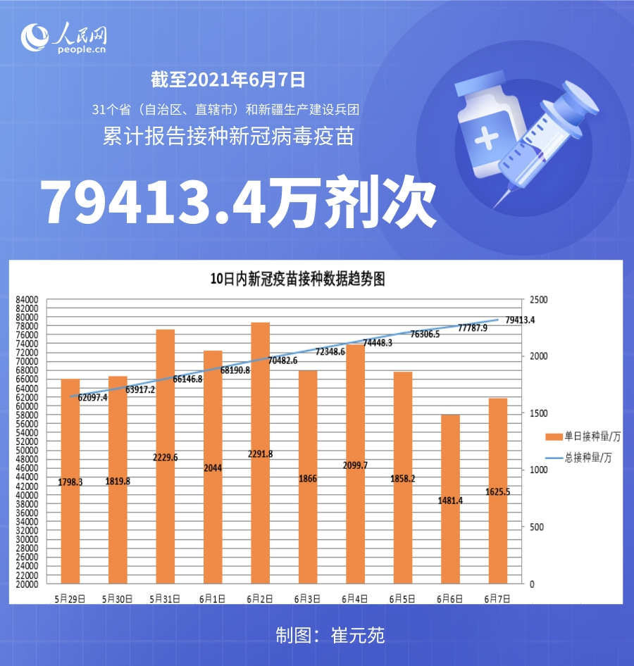 人民網北京6月8日電 (記者崔元苑)據國家衛生健康委官網消息,截至2021年6月7日,31個省(自治區、直轄市)和新疆生產建設兵團累計報告接種新冠病毒疫苗79413.4萬劑次。