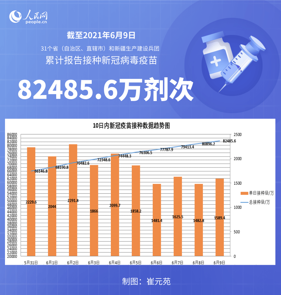 人民網(wǎng)北京6月10日電 (記者崔元苑)據(jù)國家衛(wèi)生健康委官網(wǎng)消息,截至2021年6月9日,31個省(自治區(qū)、直轄市)和新疆生產(chǎn)建設(shè)兵團(tuán)累計報告接種新冠病毒疫苗82485.6萬劑次。