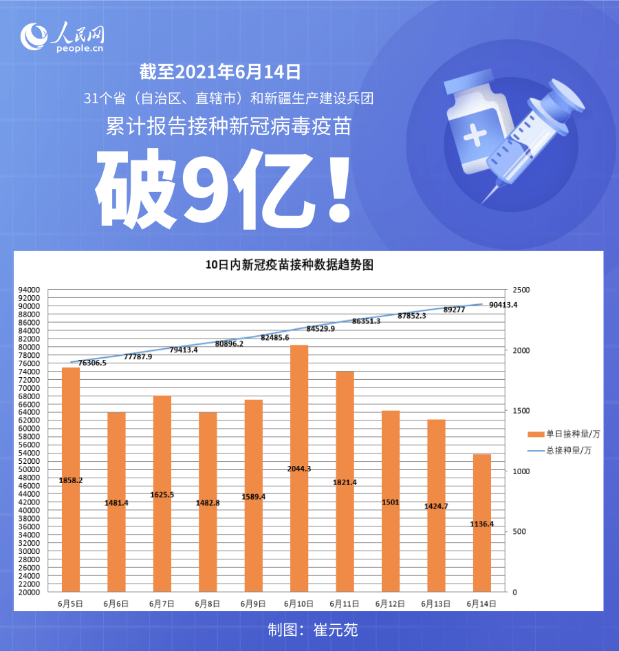 人民網北京6月15日電 (記者崔元苑)據國家衛生健康委官網消息,截至2021年6月14日,31個省(自治區、直轄市)和新疆生產建設兵團累計報告接種新冠病毒疫苗90413.4萬劑次。
