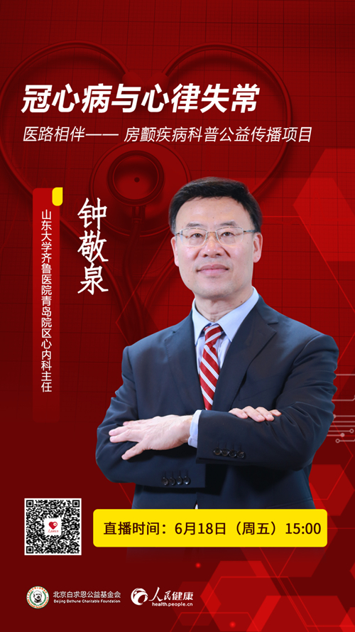 6月18日15:00-16:00,人民日報社旗下新媒體“人民好醫生”客戶端將邀請山東大學齊魯醫院青島院區心內科主任鐘敬泉做客直播間,為公眾普及冠心病與心律失常的相關知識,歡迎屆時收看。