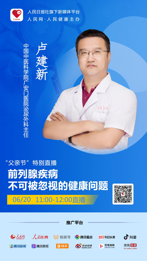 6月20日11:00-12:00,人民日?qǐng)?bào)社旗下新媒體客戶端“人民好醫(yī)生”將邀請(qǐng)中國(guó)中醫(yī)科學(xué)院廣安門(mén)醫(yī)院泌尿外科主任盧建新做客直播間,和大家分享關(guān)于前列腺健康的科普內(nèi)容,歡迎大家收看!