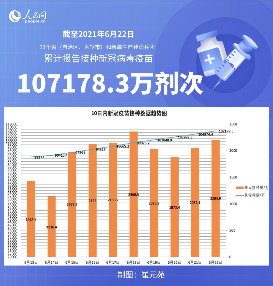 人民網北京6月23日電 (記者崔元苑)據國家衛生健康委官網消息,截至2021年6月22日,31個省(自治區、直轄市)和新疆生產建設兵團累計報告接種新冠病毒疫苗107178.3萬劑次。