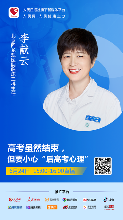 6月24日15:00至16:00,北京回龍觀醫院臨床三科主任李獻云將做客人民好醫生名醫直播欄目,和大家一起聊一聊高考后如調節心理。