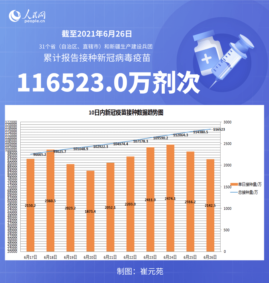 人民網北京6月27日電 (記者崔元苑)據國家衛生健康委官網消息,截至2021年6月26日,31個省(自治區、直轄市)和新疆生產建設兵團累計報告接種新冠病毒疫苗116523.0萬劑次。