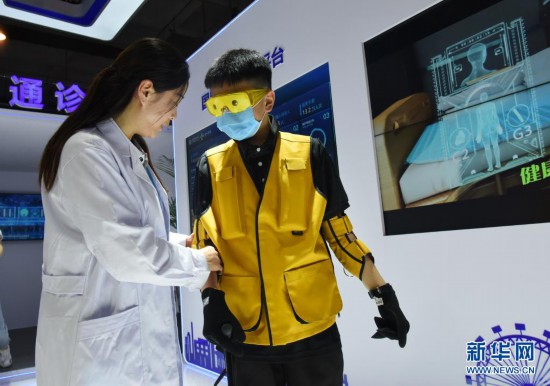 7月3日,一名參觀者在展會上通過穿戴道具體驗(yàn)“老年生活”。