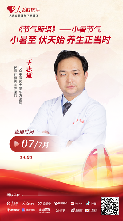7月7日14:00,我們將邀請到北京中醫(yī)藥大學(xué)東方醫(yī)院脾胃肝膽科主任醫(yī)師王志斌做客演播室,跟你聊聊小暑養(yǎng)生那些事,千萬不要錯過。