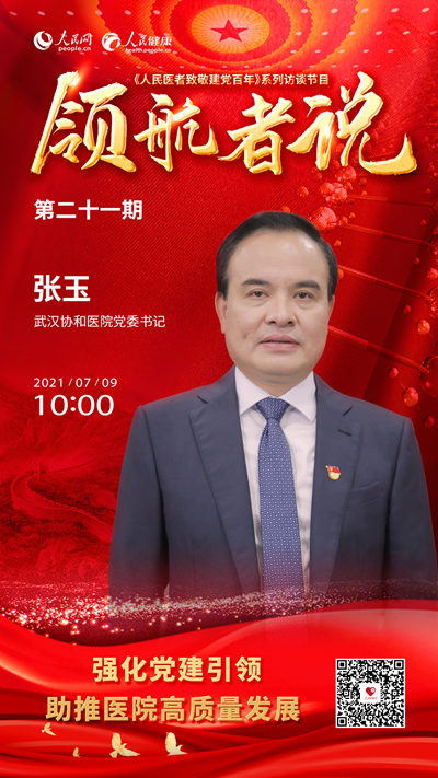 7月9日10:00,武漢協和醫院黨委書記張玉將做客演播室,以“強化黨建引領 助推醫院高質量發展”為題進行訪談。